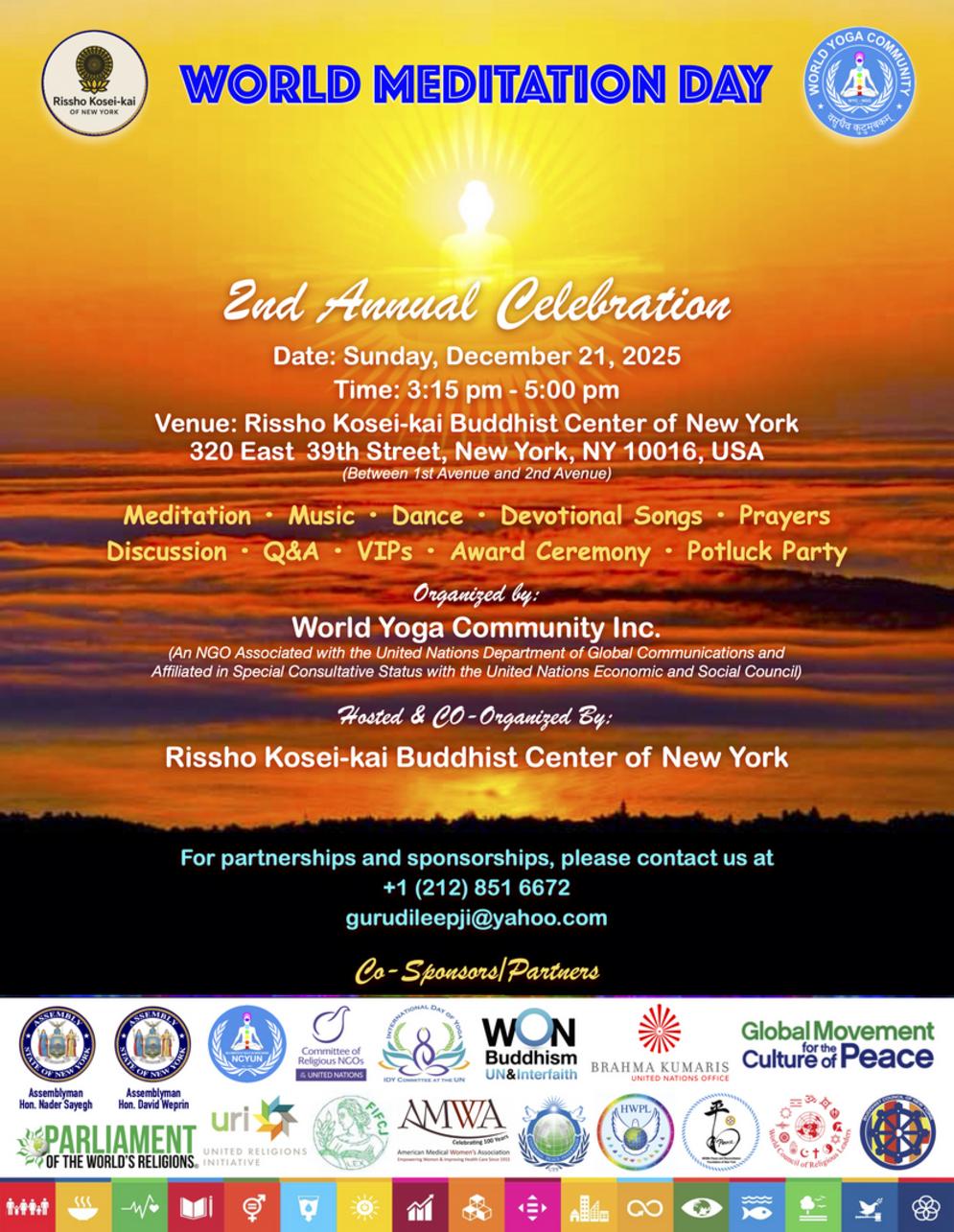 The mission of the World Yoga Community is to promote all aspects of the yogic lifestyle globally without any discrimination. World Yoga Community's vision is to establish the Sustainable Development Goals of the United Nations through its activities. World Yoga Community is organizing numerous events, gatherings festivals, and working with individuals & organizations including Missions and NGOs from the United Nations. The World Yoga Community, Inc. (WYC) is a Not-for-Profit charitable organization with 501(c)(3) Tax-Exempt Status in the USA as well as a charitable trust in India and is currently under the registration process in Argentina. World Yoga Community Inc. is an NGO Associated with the United Nations Department of Global Communications (DGC) since 2019 and an NGO Accredited to the United Nations Economic and Social Council (ECOSOC) with Special Consultative Status since 2021.